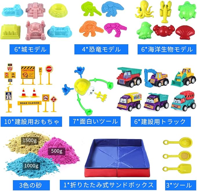 【砂遊び おもちゃセット】砂 3.0kg(紫砂 0.5kg、青砂 1.5kg、原色砂 1.0kg)、建設車両 おもちゃ 6、道路標識 10、折りたたみプール 1、収納ボックス 1、砂遊び スコップ 3、面白パーツセットx7、16種類の金型(海洋動物、恐竜、城など)。総重量4 kg。