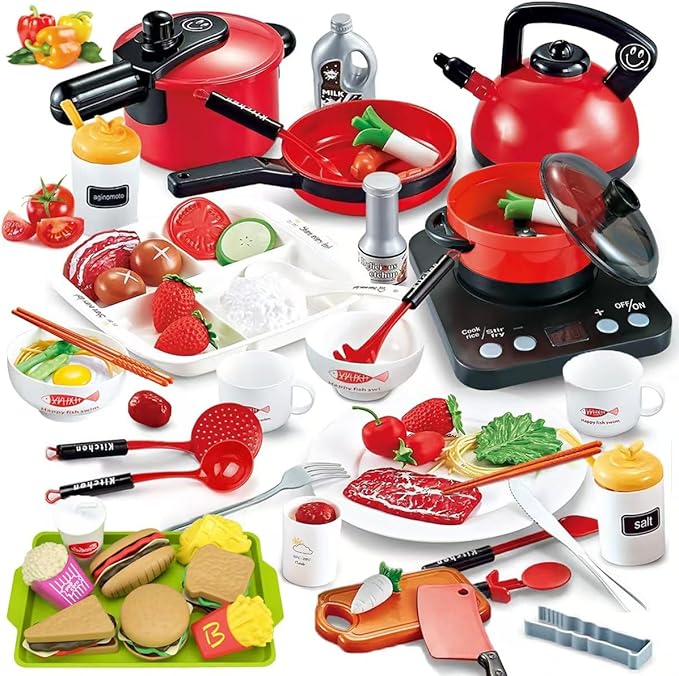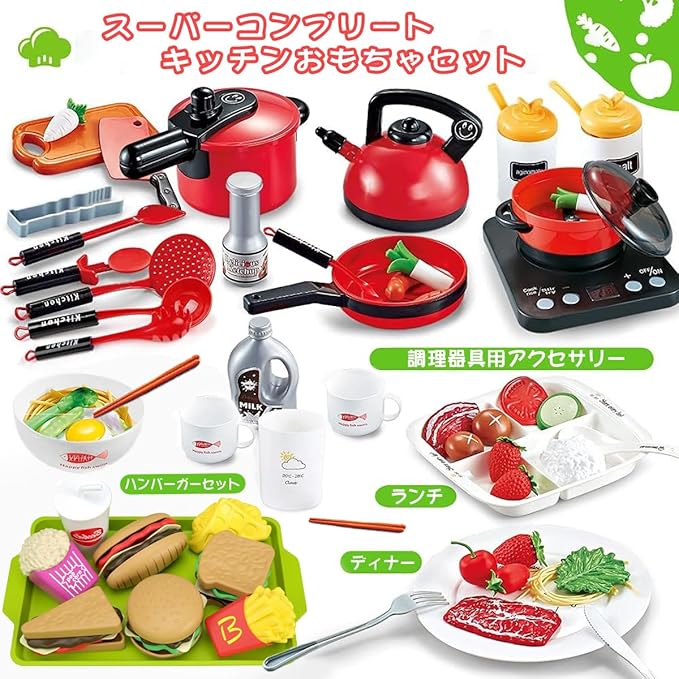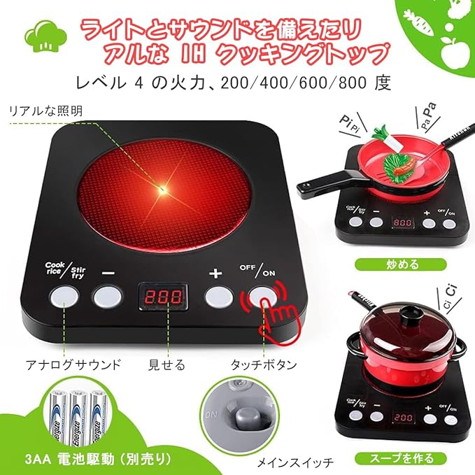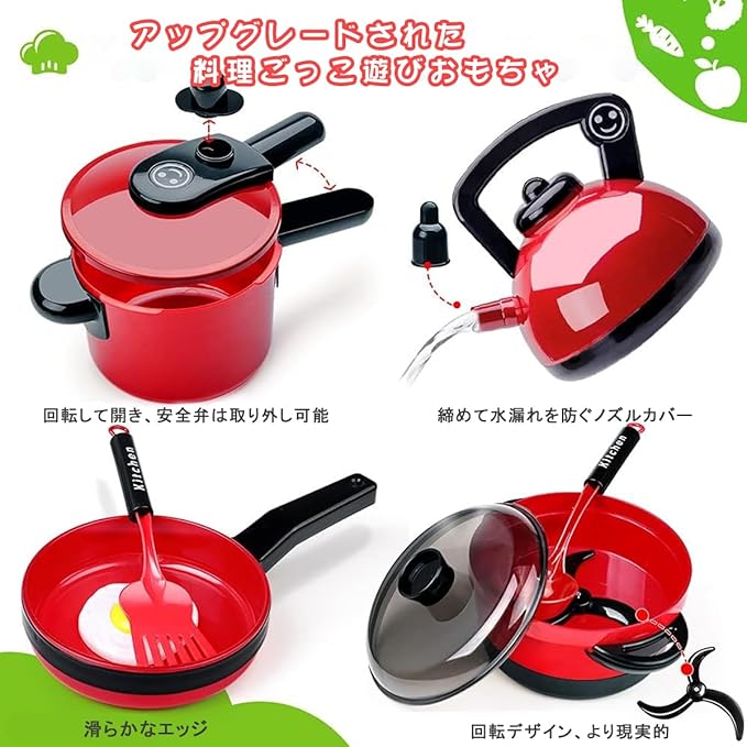 【リアルな感覚】圧力鍋に安全弁を付き、ケットルに本物の水を注すことができ、口にも蓋を付き、野菜、牛肉、卵などの材料を入れて電磁調理器のスイッチを入れ、本格的に調理を始めます。まるで本物の料理人みたい、子供がおままごとに夢中!