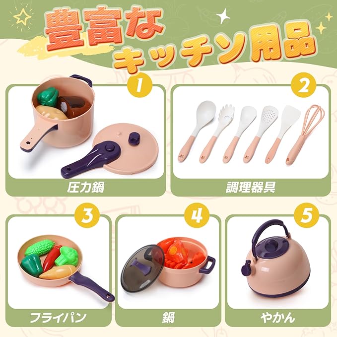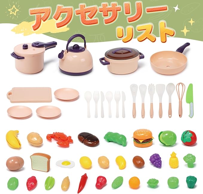 【豪華な51点セット】このセットには野菜、果物、カニ、ステーキ、食パン、キッチン用具など51点があります。包丁で切る、皮をむく、焼く、煮る…まるで調理師になったように、お子様の想像力が広がるごっこ遊びが楽しめます。遊びながら手先の器用さや創造力が自然と育まれます。