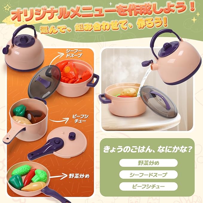 【知育に良さそう】食材を分類したり、組み合わせて料理を作ったり、盛り付けを考えたりと、遊びながら自然に考える力や発想力が育まれます。遊びの中で認識力・集中力・想像力・創造力・手先の器用さ・手眼協調性がバランスよく育ちます。自由な発想で料理を完成させる達成感がお子様の成長を促します。