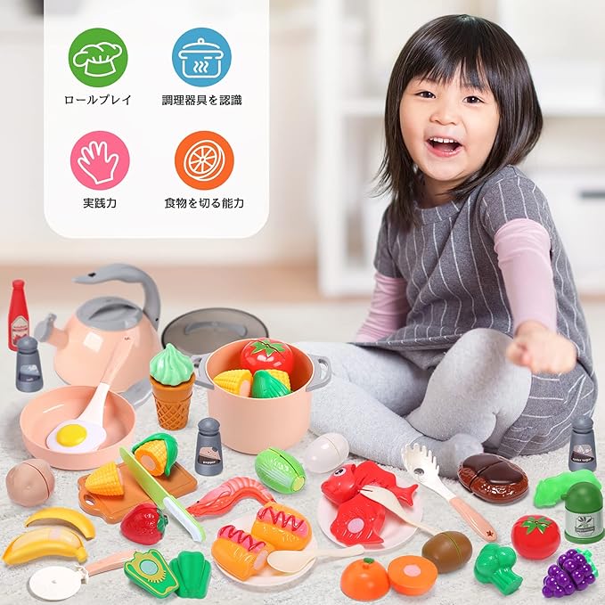【知育玩具】このキッチンセットは、果物と野菜の種類が多いのですが、子供は遊びながら食材の名前もすぐに覚えられます。また、ごっこ遊びを通じて子供の右脳開発、手眼調和、認識能力、創造力などを向上させるだけでなく、集中力などを高めて、お子様の手先が器用になる能力を鍛えさせます。
