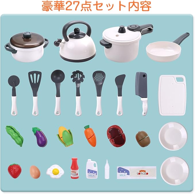 Cute Stone おままごとセット おもちゃ 知育玩具 27点セット リアル噴霧 圧力鍋 お鍋 ままごと用調理器具 贅沢食材 ごっこ遊び 親子遊び 誕生日プレゼント
