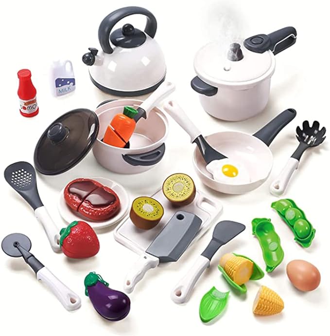 【おままごと 調理セット】リアルな調理器具、食材を切ることで、料理人ごっこに夢中しよう!セット内容:圧力鍋*1 お鍋*1 フライパン*1 ケットル*1 調理器具*6 ナイフ*1 プレート*2 まな板*1 水瓶*1 ケチャップ*1 ミルク*1 ステーキ*1 卵焼き*1 卵*1 イチゴ*1 とうもろこし*1 バナナ*1 オレンジ*1 エンドウ豆*1 ナス*1 人参*1 キウイ*1