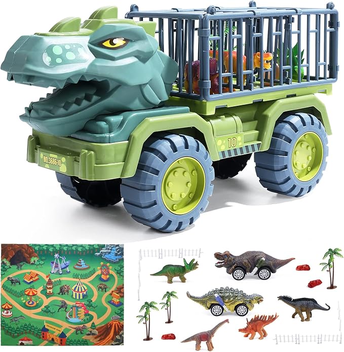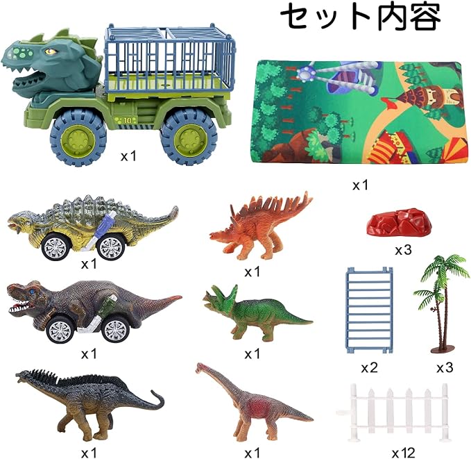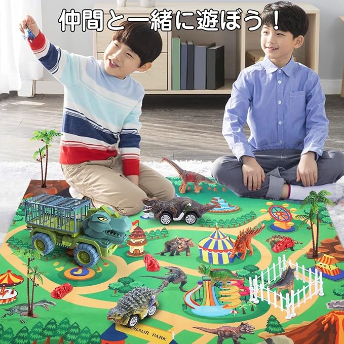 【豪華セット内容】このセットには、輸送トラック、慣性式の恐竜車、リアルな恐竜フィギュア、楽しい恐竜公園のプレイマットなどのパーツが含まれています。恐竜の世界を探検しよう!