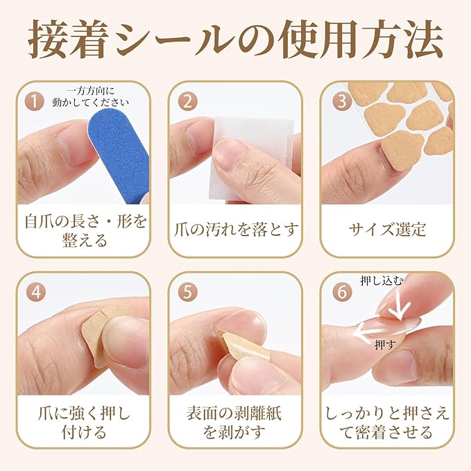 【初心者でも安心・簡単着脱】:当社のネイルグミには、便利な工具セットとわかりやすい説明書が付いてますので、初心者の方でも簡単にお使いいただけます。使用前に油分をオフし、端から空気を抜くように貼るだけで、しっかり密着&長持ち。オフする際は、シールごと指先を1分ほどぬるま湯に浸し、付属のクリスタル棒を使えばスルッと簡単に剥がせます。剥がした後もベタつかず、爪にやさしい使用感です。