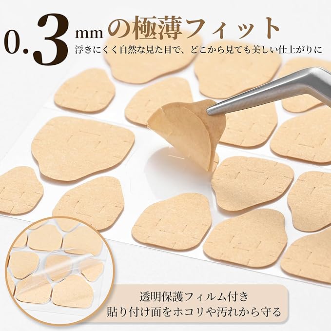【厚さ0.3mmの極薄フィット】:まるで何も付けていないような軽さと自然さ。厚さわずか0.3mmの極薄タイプで、違和感ゼロの装着感を実現。複数の切れ込み入りつけ爪シートが爪のカーブにしっかりフィットし、浮きやすいチップの端もしっかり密着。髪の毛が引っかかる心配もなく、手元をより美しく引き立てます。