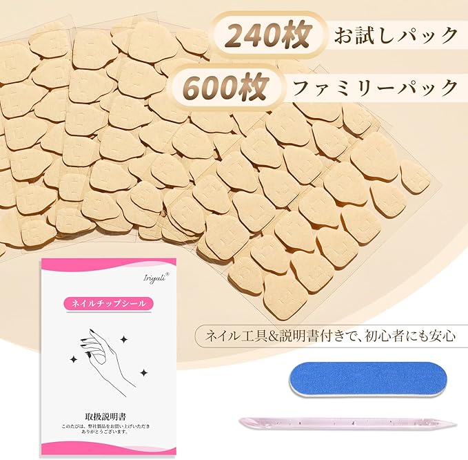 【豊富なサイズ&高コスパ】:各ネイルチップシートには12種類のサイズが揃っており、自分の爪にぴったりが必ず見つかる。10シート(240枚)・25シート(600枚)の大容量セットでコスパも抜群。色の付いた剥離紙なので残りも一目でわかり、剥離もしやすいです。ネイルを頻繁に楽しみたい方におすすめです。