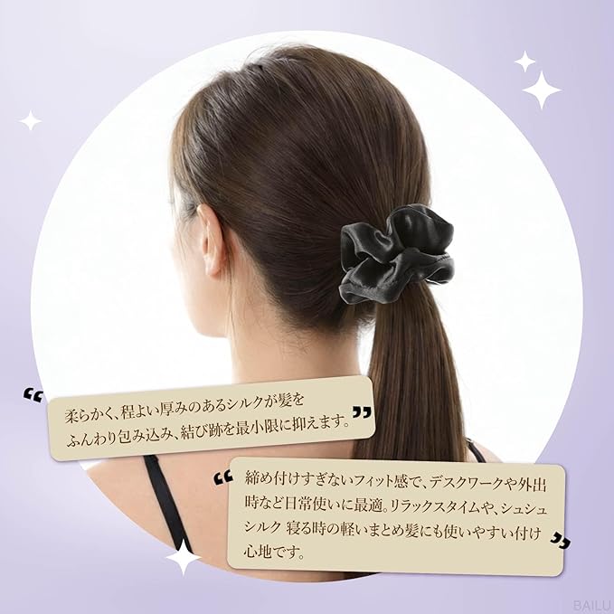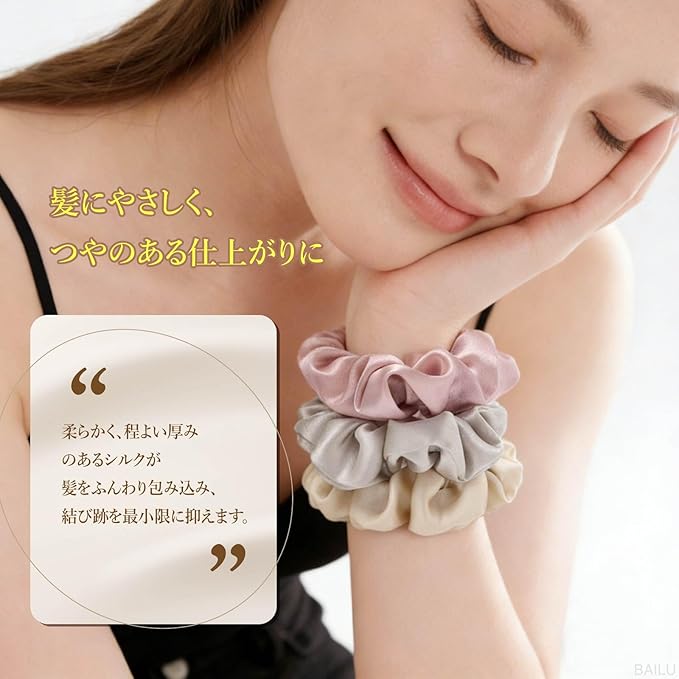 ✿【シュシュ シルク 跡がつかない】 なめらかなシルク素材が髪をやさしく包み込み、長時間結んでもシュシュ シルク 跡がつかない設計。外すときも絡まりにくく、抜け毛や切れ毛を防ぎます。