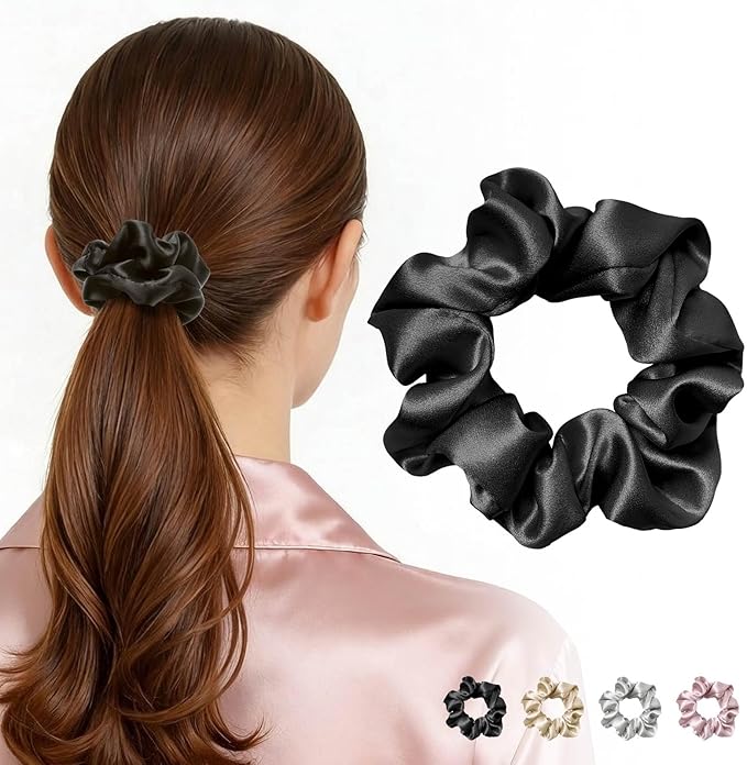 BaiLu 6A級シルク100%シュシュ 大きめ 跡がつかない 髪に優しい 髪ゴム・ヘアゴム 光沢 おしゃれ ギフトにも最適 (ブラック, 太め 3.5cm (1個単品))