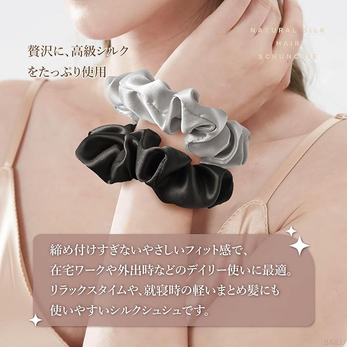 ✿【程よいホールド感で快適】 締め付けすぎないフィット感で、デスクワークや外出時など日常使いに最適。リラックスタイムや、シュシュ シルク 寝る時の軽いまとめ髪にも使いやすい付け心地です。
