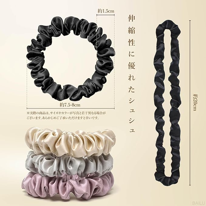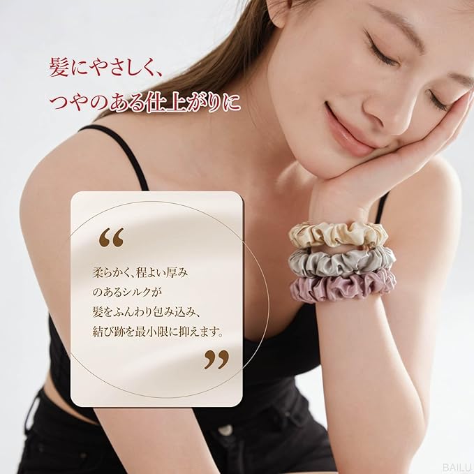 ✿【シュシュ シルク 跡がつかない】 なめらかなシルク素材が髪をやさしく包み込み、長時間結んでもシュシュ シルク 跡がつかない設計。外すときも絡まりにくく、抜け毛や切れ毛を防ぎます。
