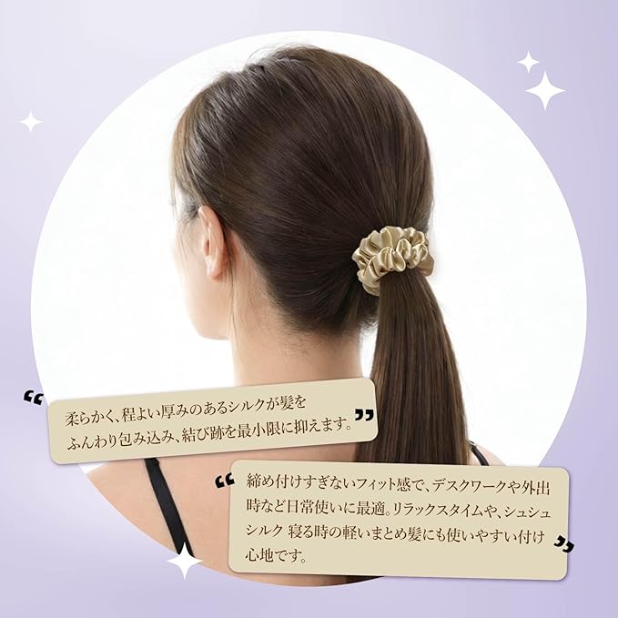 ✿【程よいホールド感で快適】 締め付けすぎないフィット感で、デスクワークや外出時など日常使いに最適。リラックスタイムや、シュシュ シルク 寝る時の軽いまとめ髪にも使いやすい付け心地です。
