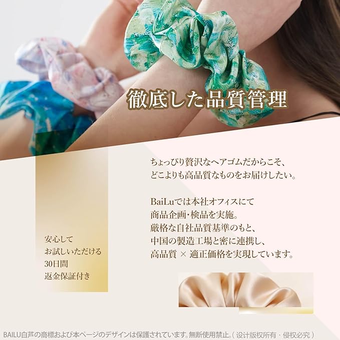✿【シュシュ 天然シルク 100% 】 天然シルク100%を使用したシュシュ シルク100。シルクは人の髪と同じタンパク質由来の繊維で、摩擦や静電気を抑え、一般的なヘアゴム・髪ゴムに比べて髪への負担を軽減します。