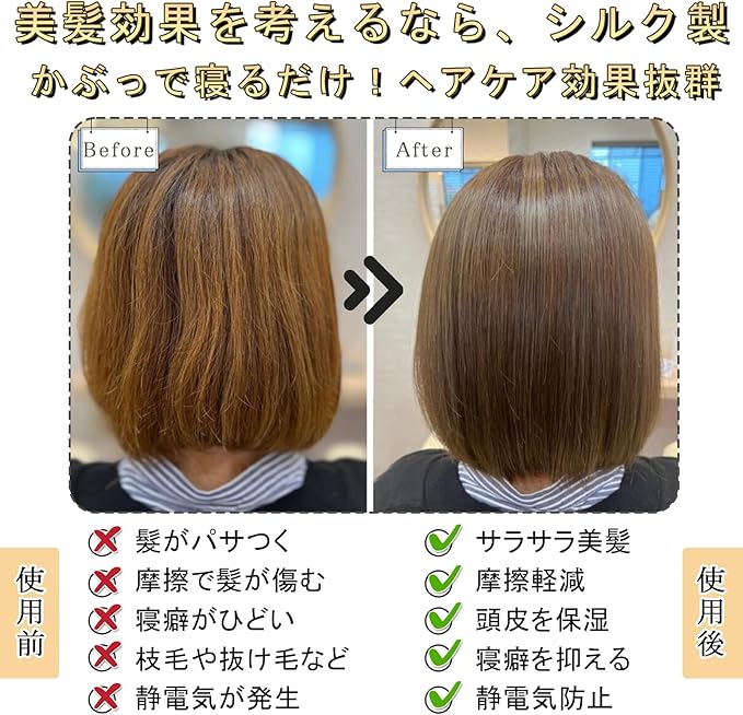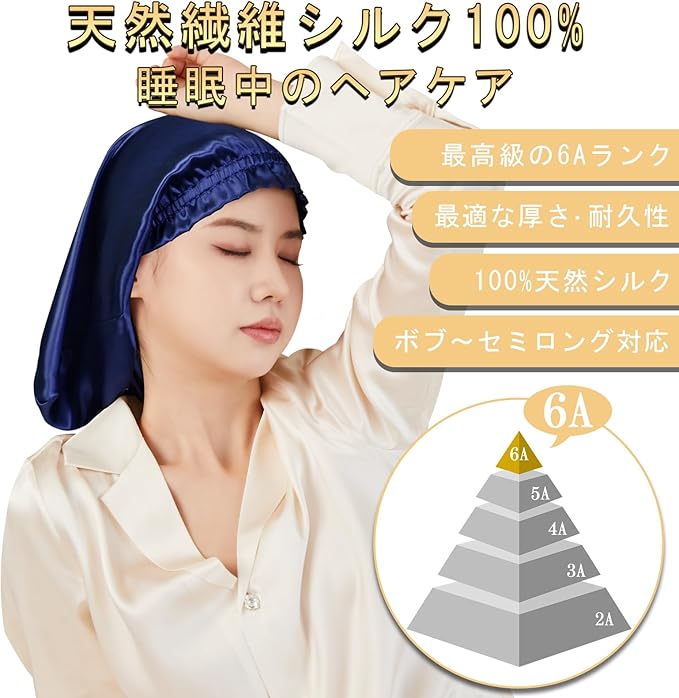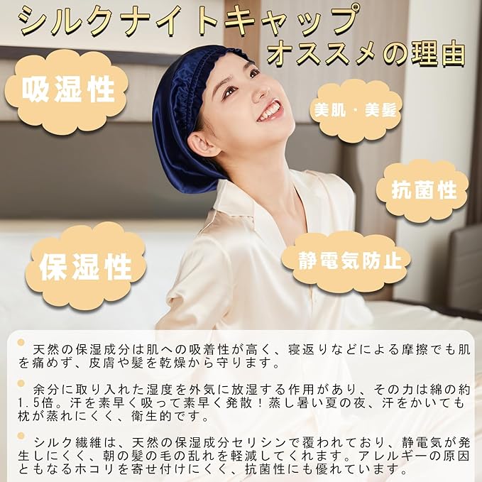 シルクは古代から愛用され、人間の肌と同じタンパク質でできているシルクの素材は真珠のような光沢、吸湿性と放湿性に優れている、紫外線を吸収できるというメリットがあります。 シルク製のナイトキャップ は、保湿性能も高く、頭皮や髪の乾燥を防いでつややかな美髪をサポート。