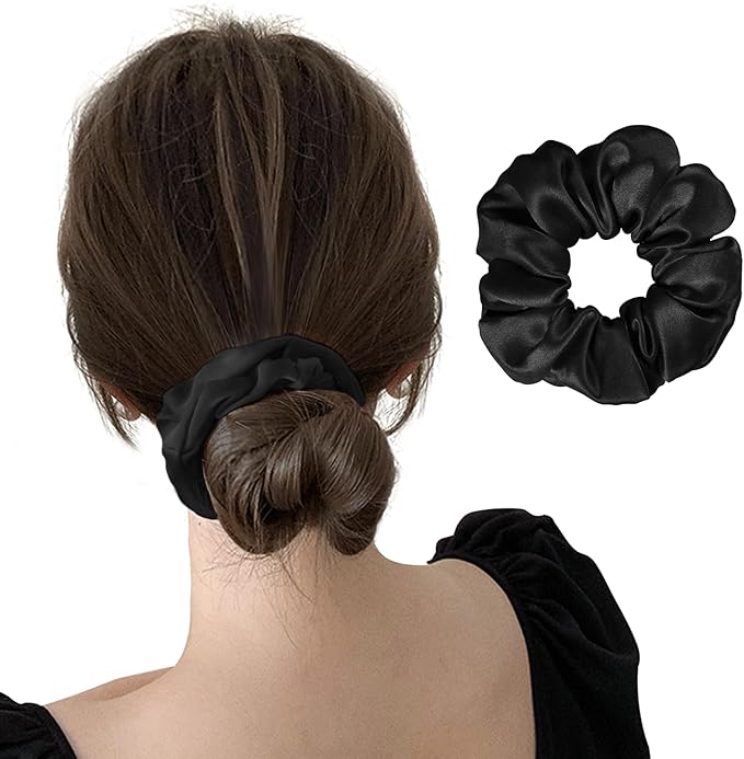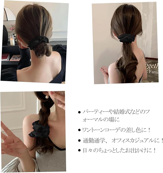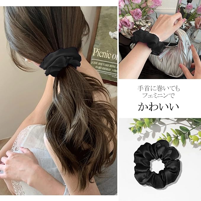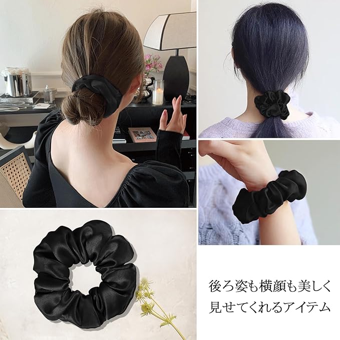 【高級感のあるシルクシュシュ】ふわふわボリューム、ツルツルな光沢、極上の肌触り、毎日使っても表面に毛玉が出来ません!上質なシルクにゴムを通した「シュシュ」、ヘアゴムとは一味違った華やかな印象のヘアスタイルを作ることができます!