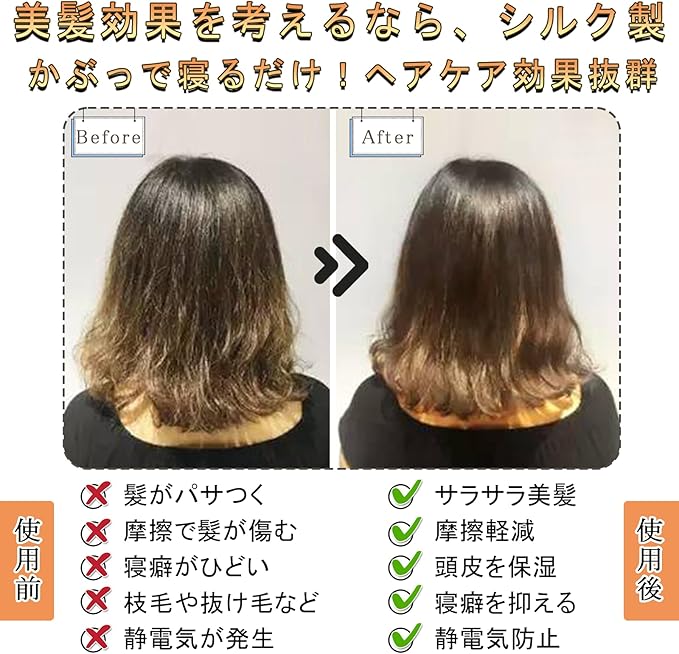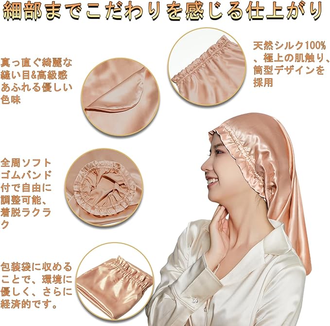 シルクは古代から愛用され、人間の肌と同じタンパク質でできているシルクの素材は真珠のような光沢、吸湿性と放湿性に優れている、紫外線を吸収できるというメリットがあります。 シルク製のナイトキャップ は、保湿性能も高く、頭皮や髪の乾燥を防いでつややかな美髪をサポート。