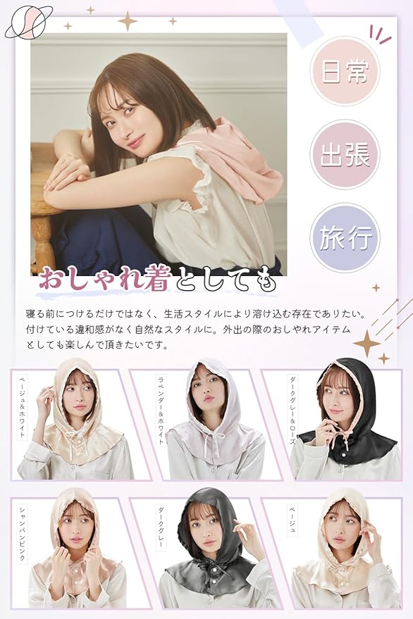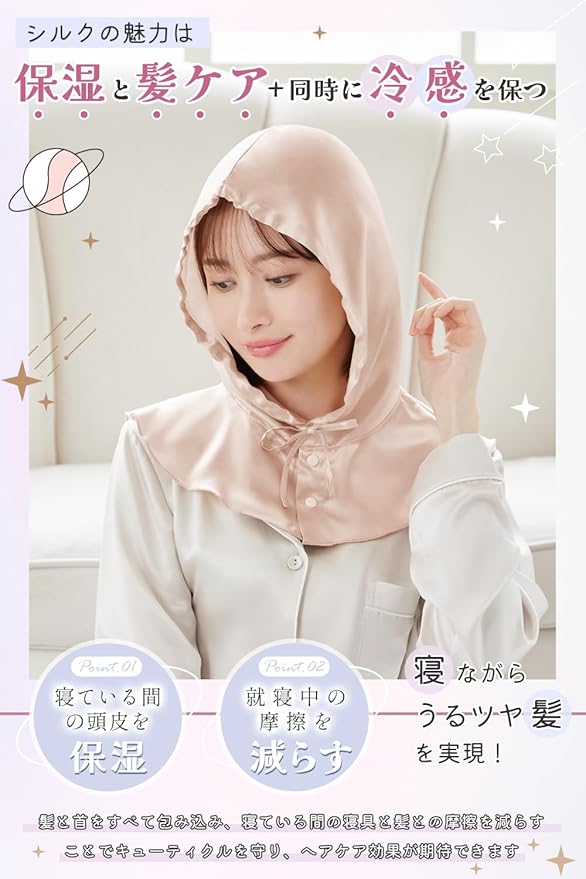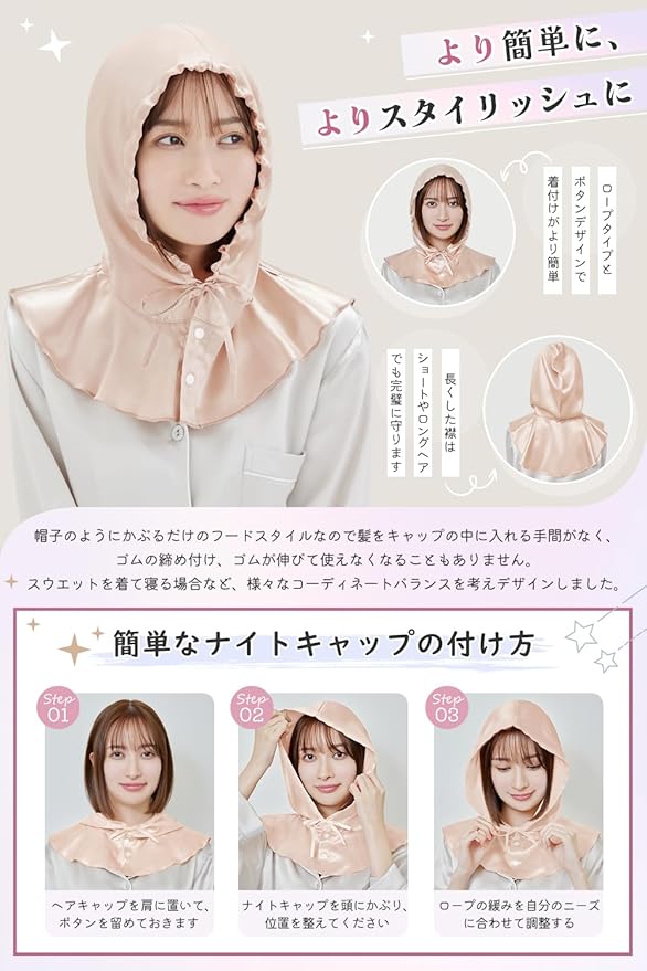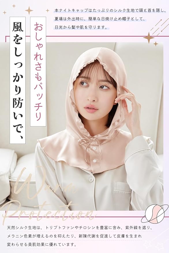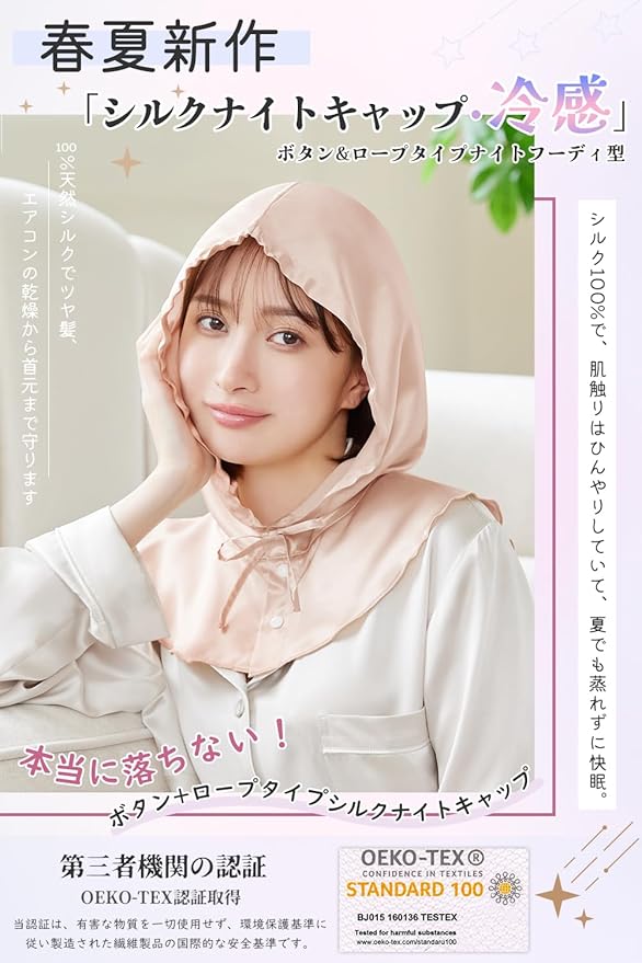 Utukkyは最高品質シルク100%のシルク製品を取り扱っております。ハイ限定商品などで使用されるものと同じ最高級6Aクラスの生地を厳選使用。世界に流通するシルクの80~90%が生産される中国の品質判断基準(糸の均一性、不純物の少なさ、羽毛の少なさ、引張強度、伸張度)から最も高品質な6Aのグレードを採用しています。日々シルク製品の調査と研究に専念し、オシャレな設計と実用的な機能を兼ね備えた安全な最高品質シルクを提供いたします。また、厳格な品質管理とアフターサービスにより、幅広い層のお客様にお選びいただけるシルク製品を提供いたします。 2024年夏秋新作・ロープタイプ帽子型シルクナイトキャップ、本シルクナイトキャップは筒型ヘアキャップとは異なり、フード型のデザインを採用しており、首の部分をすべて包み込みます。髪をケアするだけでなく、寝ている間の寝具との摩擦を減らす同時に、就寝中に気になる首と肩周りや頰などの冷えもケアすることができます。また、帽子のようにかぶるだけのフ一ドスタイルなので髪をキャップの中に入れる手間がなく、ボタンデザインでゴムがないので、着脱が簡単の同時に跡が付きにくく、朝の気持ちが明るくなる!フ一ドを深めに設計しており、寝返りなどで朝までずり落ちにくい!そして、寝る前につけるだけではなく、生活スタイルにより溶け込むこともできて、外出時に付けた違和感がなく自然なスタイルに!たっぷりのシルク生地で頭と首を隠し、サングラスを組み合わせることができます。簡単な日焼け止めとして、日光から髪や肌を守ります。プレゼントとして落ち着いた綺麗な色合と優雅な光沢で高級感溢れるシルク100%のナイトキャップで、自分を甘やかしてあげて下さい!また母の日、父の日、クリスマス、バレンタイン、新年などのイベント時に進化版シルクナイトキャップはプレゼントとしてもオススメ!誕生日、ご結婚、新居購入、進学就職などの祝い事に、ギフトとして喜ばれる事間違いなし!