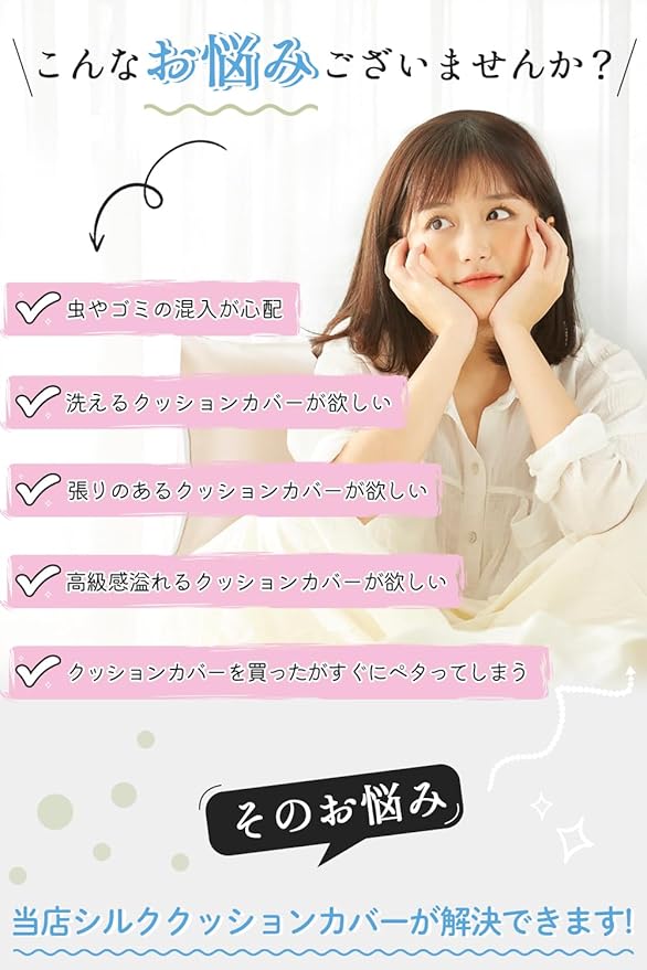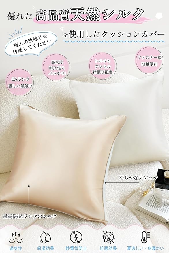 【肌に優しい&至高の肌触り&アレルギー対策】シルククッションカバーの魅力は、その比類なき肌触りにあります。肌に触れた瞬間、まるで雲の上に乗っているかのような感覚に包まれます。シルクは「美容繊維」とも呼ばれ、天然のアミノ酸を含んでおり、肌の保湿を助け、ハリやツヤを維持します。また、シルクの滑らかな表面は摩擦を減らし、しわの形成を防ぐ効果もあります。特に、顔を直接シルククッションカバーに当てて寝る習慣がある方にとっては、この効果は顕著です!