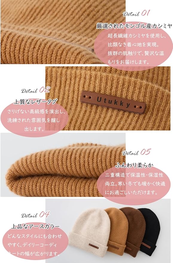 [Utukky] カシミヤニット帽 冬 防寒 【表地:カシミヤ100%+裏地:シルク100% 】 メンズ レディース 高級素材 暖かい 肌に優しい 柔らかい 伸縮性 抗菌防臭 ニット帽子 防寒ニット帽 帽子 無地 シンプル 通勤通学 フリーサイズ 男女兼用