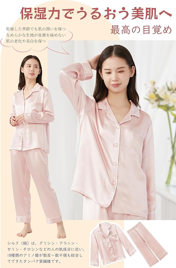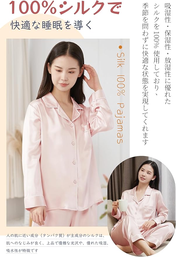 Utukkyシルク長袖パジャマは、通年で快適にお使いいただけるよう、通気性と吸湿性を両立させた優れものです。蒸し暑い夏の夜でも、シルクの涼しさが心地よい睡眠を保証します。さらに、シルクには適度な保温力があり、肌を過度に冷やすことなく快適な室温を保つことができます。夏でも窓を開けた涼しい夜は、シルクの暖かみで心地よく眠れます。一年を通じた着用に耐えうる天然素材のシルクレディースパジャマは、睡眠の質にこだわる方におすすめの逸品です。
