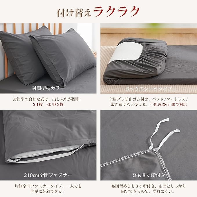 <セット内容&仕様>:「掛け布団カバー(1枚)」:片側に210cm全開ファスナー使用 / 布団留めひも8ヶ所付き ・ 「ボックスシーツ(1枚)」:全周ズレ防止ゴム付き / 通常サイズより大きめなので、高さ3-28cmの敷き布団とマットレスの底まで包む可能 ・ 「枕カバー(1枚)」:封筒型で、出し入れが簡単