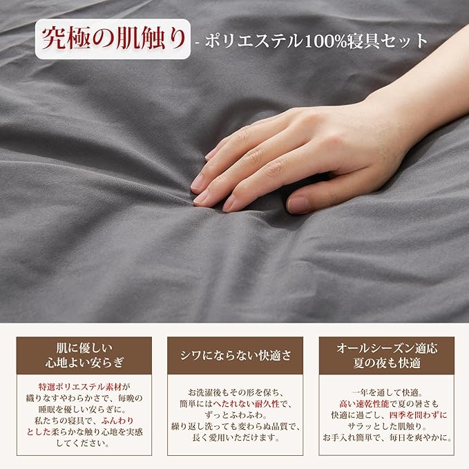 <優れた通気性>:通気性と吸湿・放湿性が優れて、夏の場合は、汗をかいても素早く湿気を吸い取り発散してくれるので、いつでもサラサラとした状態が保てます。冬の場合は、カバーの繊維と繊維の間に暖かな空気をためてくれるので、保温性が高いです。四季通用。