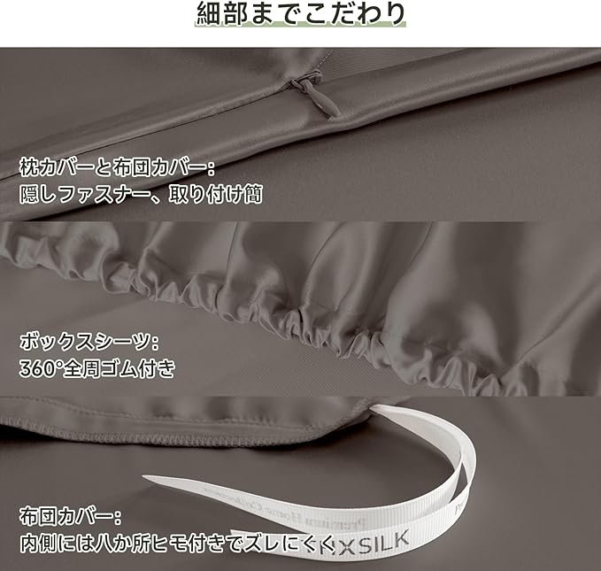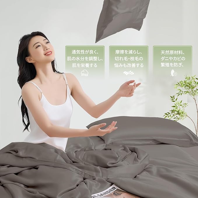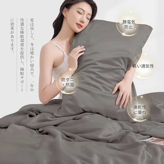 【美髪・美肌】生地の表面は滑らかで摩擦が少ないため、切れ毛・枝毛の悩みも改善できます。その滑らかな表面のため、しわもある程度減少します。生地は通気性が高く、肌の水分を調節し、肌に栄養を与えます。。ほこりやダニを防ぐ特性もあり、敏感肌の方にも安心してお使いいただけます。