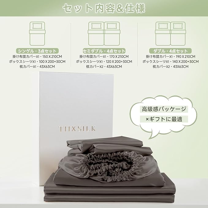[THXSILK] 布団カバーセット 寝具カバー セット シルク 美髪・美肌 敏感肌 静電気防止 防ダニ・抗菌 洗濯機可 吸水速乾 OEKO認証 環境に優しい 睡眠サポート 寝癖軽減 春夏秋 ギフト(ダークグレー ダブル・4点セット)