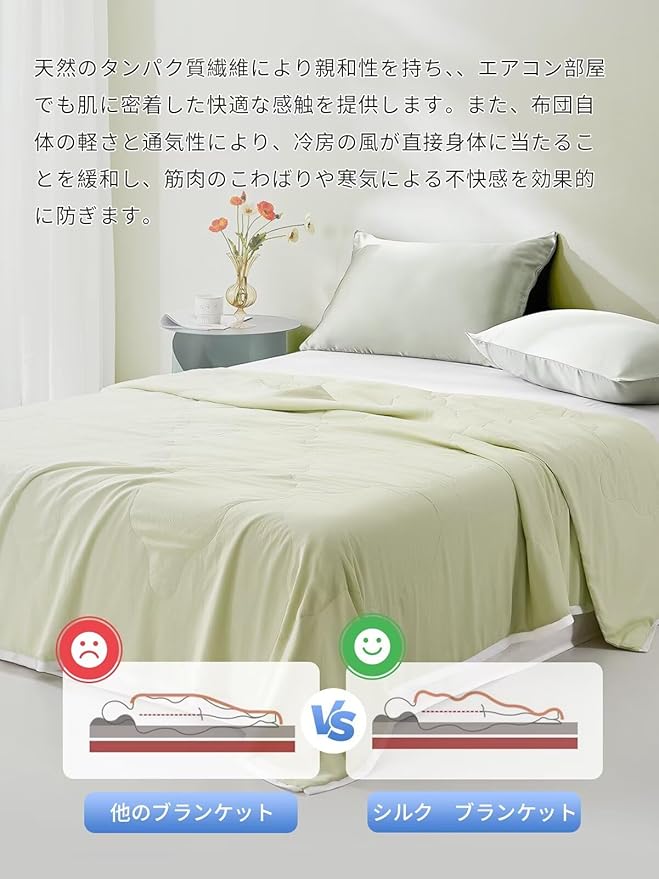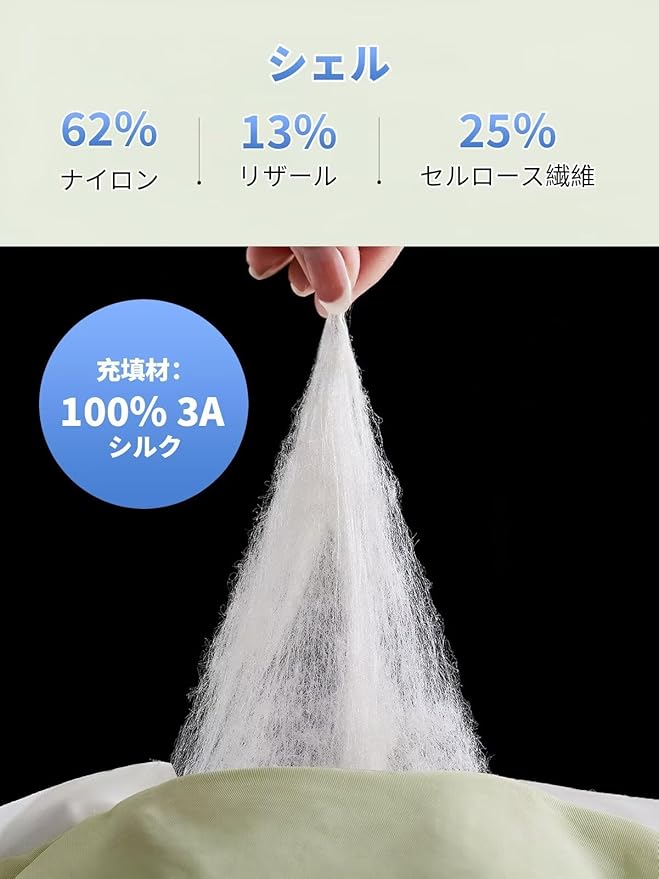 ★天然繊維: 100% 天然絹糸を使用しており、多孔質構造により優れた通気性を発揮します。体温を常に快適な状態に保ち、蒸れを防ぎ、敏感肌の方でも心地よく使用できます。特に夏場の快眠をサポートする「涼感指数 0.23」設計で、冷たすぎず快適な涼しさを提供します。