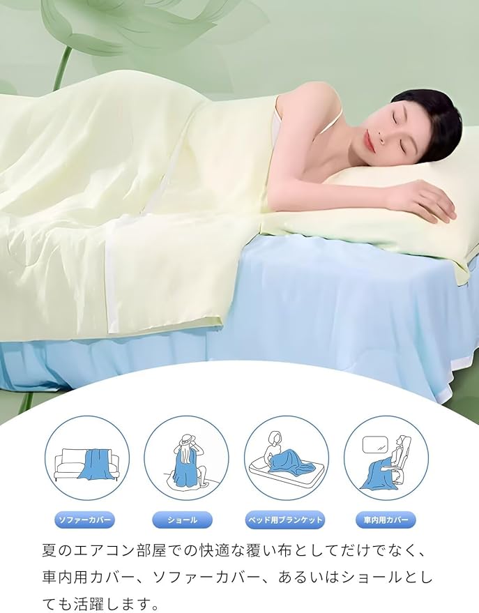 ★使い勝手の良さ: 夏のエアコン部屋での快適な覆い布としてだけでなく、車内用カバー、ソファーカバー、あるいはシュールとしても活躍します。一枚でさまざまなシーンに対応でき、使い道の幅広さとコスパの抜群さが魅力的です。