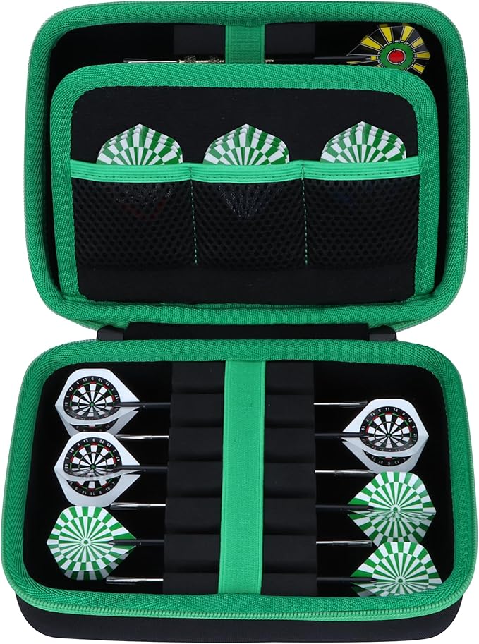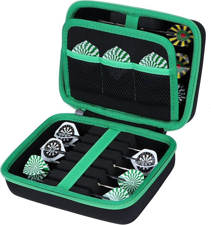 Lebakortストレージボックスはスチールチップダーツやソフトチップダーツ用に設計されています。このダーツスーツケースは超広い輪郭を持っており、硬い泡の溝の中に12本のダーツを収容することができ、エッジを押し出すことがなく、フィットする溝とポケットは硬い先端ダーツのすべての部品を持ち運ぶことができ、優れた保護を提供する。中央部分には仕切りがあり、片側には大きなメッシュポケットがあり、ダーツシャフトのダーツヘッドやその他の小物を収納するのに使用できます。反対側には3つの小さなメッシュポケットがあり、ダーツウィングの取り付けにも使えます,メッシュ袋の入り口から平らに差し込み、メッシュ袋の弾力性により物を効果的に固定し保持します。露出した位置によって、効果的にダーツウィング形を判断することができます。ダーツをくぼみに押し込むことで、フライトの形状が変形するのを効果的に防ぎます。柔らかい内装はダーツとパーツの摩耗を防ぎます。十分な保護があるため、アウトドアに持ち出してもダーツが壊れる心配はありません。