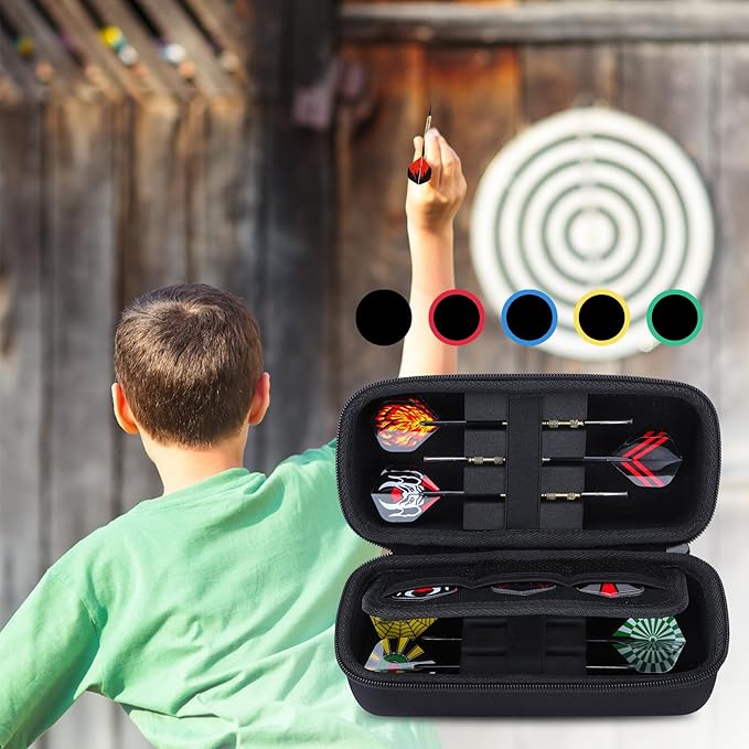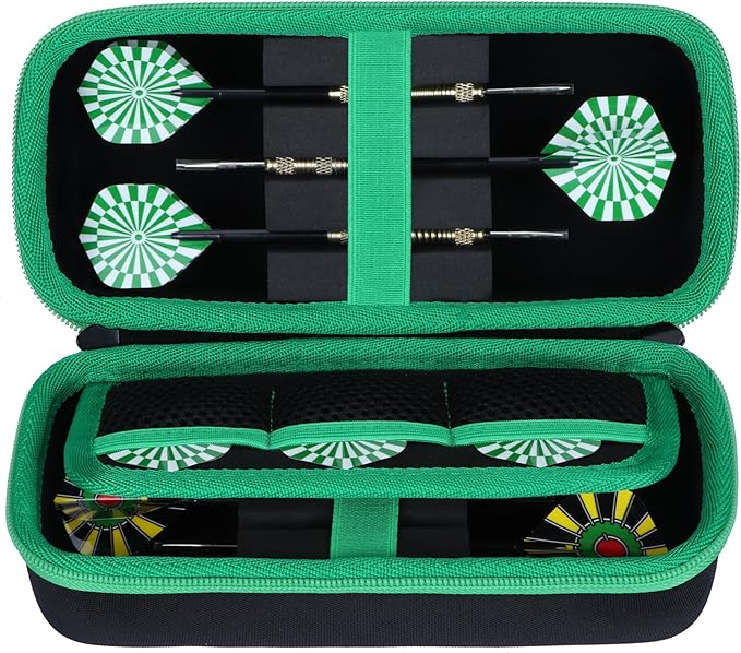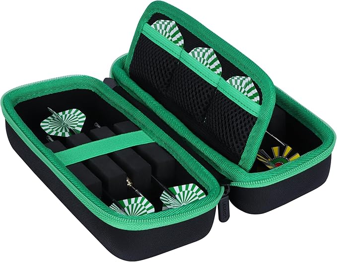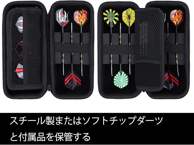 Lebakortストレージボックスはスチールチップダーツやソフトチップダーツ用に設計されています。ダーツボックスの上下2つの部分にはダーツ専用カードスロットが設計されており、弾性帯固定、6つのダーツを収容することができ。中央部分には仕切りがあり、片側には大きなメッシュポケットがあり、ダーツシャフトのダーツヘッドやその他の小物を収納するのに使用できます。反対側には3つの小さなメッシュポケットがあり、ダーツウィングの取り付けにも使えます,メッシュ袋の入り口から平らに差し込み、メッシュ袋の弾力性により物を効果的に固定し保持します。露出した位置によって、効果的にダーツウィング形を判断することができます。ダーツをくぼみに押し込むことで、フライトの形状が変形するのを効果的に防ぎます。柔らかい内装はダーツとパーツの摩耗を防ぎます。十分な保護があるため、アウトドアに持ち出してもダーツが壊れる心配はありません,保護ケースはコンパクトなのでリュックの中に入れるのに適しており、EVAのケースは衝突によるダーツの損傷を防ぐのに有効です。