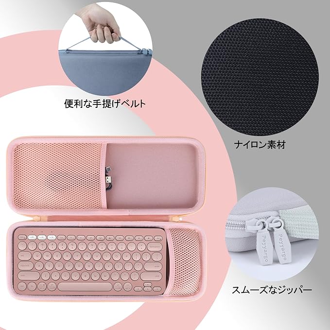 高品质なPeyyargo収納ケースはLogicool PEBBLE KEYS 2 K380s ワイヤレスキーボードをしっかり保護できます。同収納ケースは高密度EVAと強化ナイロン素材を採用し、ナイロン生地は高い引き裂き抵抗性を持ち破損・割れを防ぎ、EVA素材は湿気防止機能でキーボードを湿気から守ります。内部の高品質ビロード生地がキーボードの損傷を効果的に防ぎ、緩衝構造は移動中の外部圧力からも保護します。シンプルデザインで使い勝手が良く、日常持ち運びに最適です。