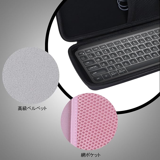 Peyyargo収納ケースの収納デザインは整理を一層シンプルかつ便利にします。PeyyargoのLogicool MX KEYS MINI ワイヤレスキーボード用収納ケースは、効率的な収納を実現するための細心の設計が随所に体現されています。タブレットアクセサリー収納ケースの上部にはネットポケットが設けられ、充電器などのアクセサリーを収納できる大容量設計となっています。下半部はLogicool MX KEYS MINI ワイヤレスキーボードをして収納でき、外部からの衝撃時にキーボードを十分に保護し、ダメージを軽減します。タブレットアクセサリー内部は柔らかいビロード生地のライナーで覆われ、Logicool MX KEYS MINI ワイヤレスキーボードの表面が傷つくのを全方位的に防ぎます。Peyyargoの同収納ケースは全体的にコンパクトなサイズでスペースを取らないため、日常の移動にも、ビジネスの外出にも便利です。