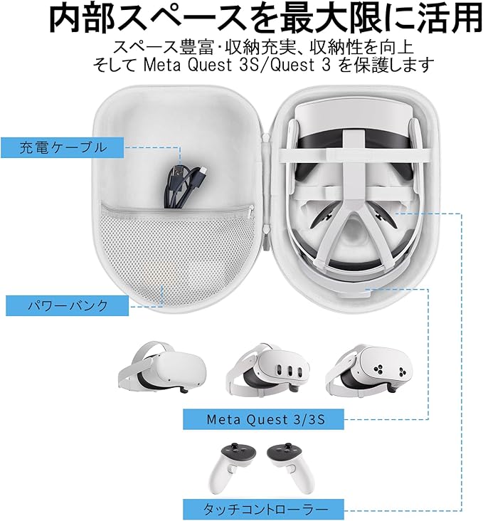 Peyyargo の Meta Quest 3S及び Meta Quest 3 コントローラー付きのオールインワンVR・MRヘッドセット に対応する収納ケースは、アウトドアでの VR 体験の効率を高めます。同収納ケースと互換性のある meta quest 3 コントローラー付きのオールインワンVR・MRヘッドセットやその他小物部品は、収納ケースを通じて効率的に統合できます。Peyyargo の総合的な収納ソリューションにより、整理が苦手な人でも、自然に VR・MR ヘッドセット本体、コントローラー、小物部品を分類して収納する習慣を身につけることができます。注意:本リンクではケースのみを販売しております!! Meta Quest 3S及び Meta Quest 3 コントローラー付きのオールインワンVR・MRヘッドセット本体並びに付属品は含まれておりません。