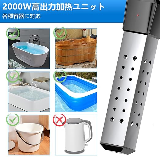 ♨️【 2000Wの高出力加熱】:高出力標準加热素子を採用し、迅速かつ効率的に加热。数分間で19~76リットルの水を升温可能です。エアープールや浴槽、キャンプなど、多様な温水需要を満たし、桶、洗面器、キャンピングカーなどの容器加熱に理想的な選択です。