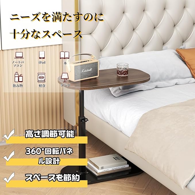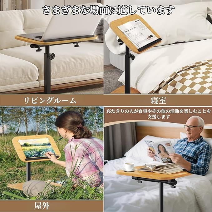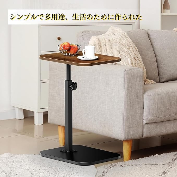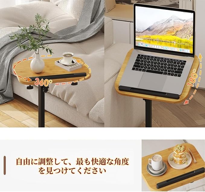 【高さ調節可能なトレイテーブル】このC字型エンドテーブルは、用途に合わせて高さを45cmから80cmまで調節でき、テーブルの脚はソファ、ベッド、椅子の脚に柔軟にスライドさせることができます。また、テーブルトップは360 回転機能を備えているため、角度を自由に調整して、より快適かつ完璧に使用できます。