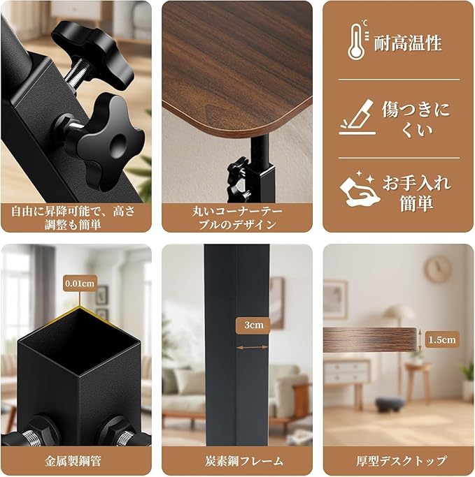 サイドテーブル 昇降式 ソファーテーブル 360度自由回転 高さ調節 ソファーテーブル耐水 小型 ベッドサイドテーブル 省スペース おしゃれ 組立簡単 耐荷重がいい 耐久性 小型家具 家用 (クルミ色+ブラック)