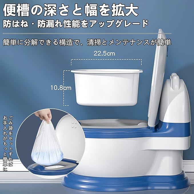 【楽しいトイレトレーニング】:このトイレトレーニングポットは、お子様が自信と自立心を育むのをサポートします。1:1で大人用トイレを再現したデザインで、お子様がトイレを認識しやすく、スムーズに大人用トイレへ移行できるよう設計されています。お子様が楽しく快適に学べる環境を提供します。