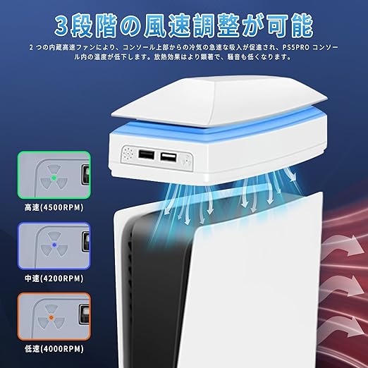 【新登場PS5 Pro用上部冷却ファン】PS5 Pro用上部放熱ファン。防塵設計、3段調整可能冷却システム、8モードRGBカラーランプバンド、追加2つのusbポート。これらの機能は、プレステ5 pro本体寿命を延長し、ゲーム体験を向上させるだけでなく、クールなゲーム気分を提供します。ディスク/デジタル版の両対応。