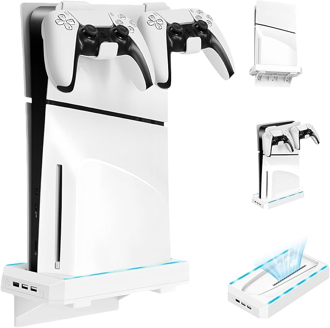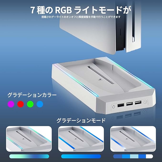 新型PS5 Slim用 縦置きスタンド 冷却 コントローラー ヘッドホンハンガーホルダーセット【2026 新登場- 壁掛けと水平置きに対応】 Tomistan RGBライト搭載 滑り止めパッド付き PS5 Slim ディスク/デジタル版兼用 3つのUSBポート 転倒防止・地震対策・放熱対策・傷付き防止・収納・ABS素材 簡単取り付け 安定性 PS5 周辺機器
