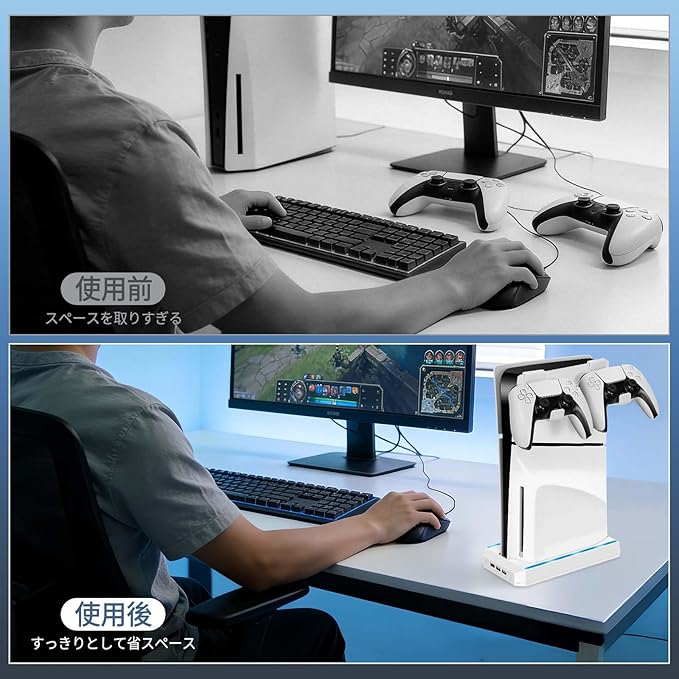 【PS5 slim壁掛け / デスクトップスタンド】PS5 Slim ディスクエディション&デジタルエディション専用の縦置きスタンドです。底部に滑り止めシリコンリングを 6 つ備え、卓上にしっかりと固定することができます。PS5 本体が予期せぬ衝突によって落下するのを効果的に防ぎさらに、固定用ネジを付属しているため、テレビの近くや脇に簡単に取り付けることができ、最高のゲーム体験をお届けします。本製品にはコントローラーとイヤホン用のフックを 2 つ付属しており、収納が便利になり、散らかったデスクトップとおさらばできます。