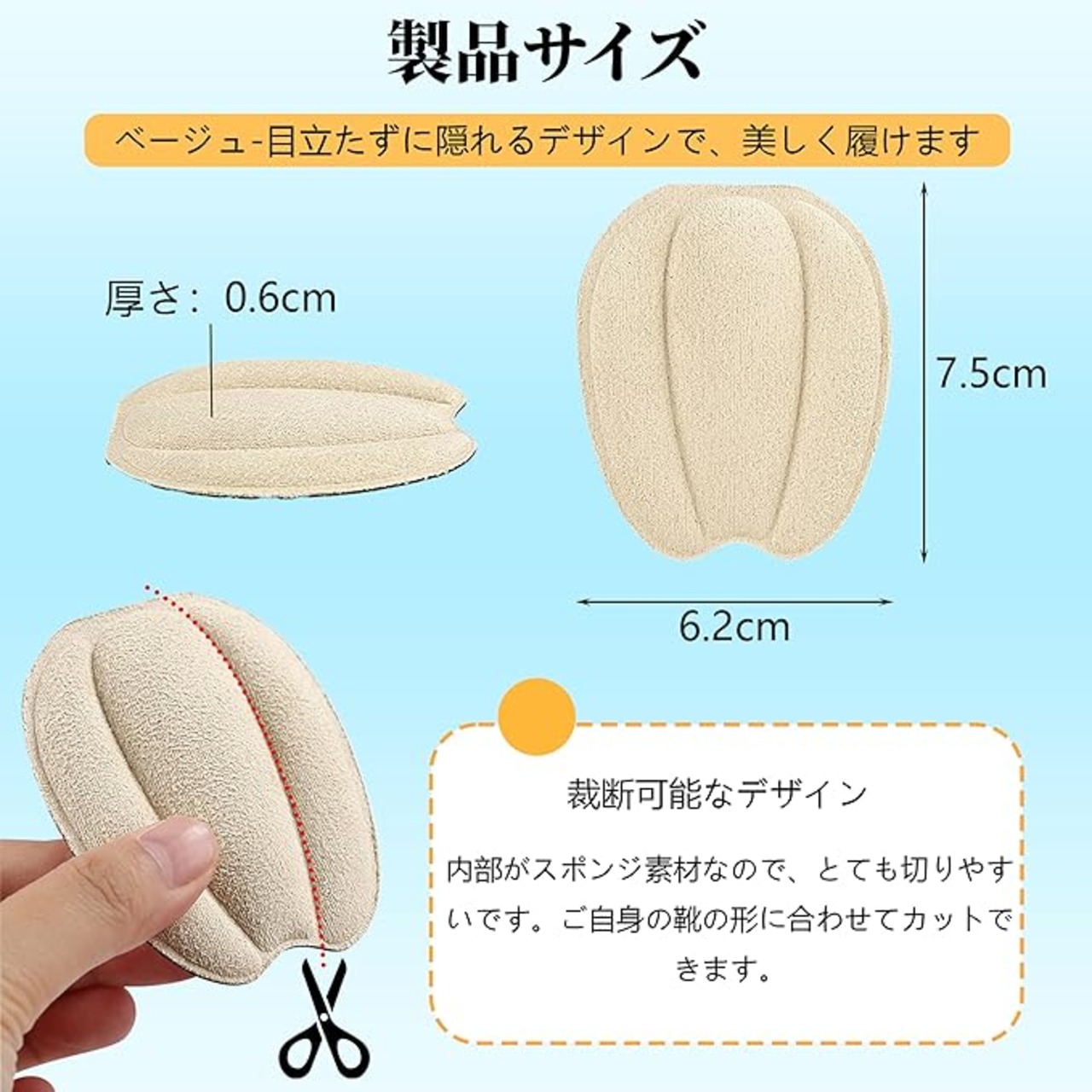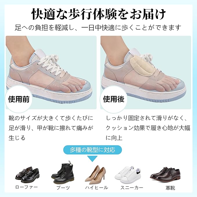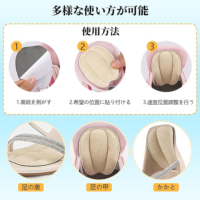 【多様な使い方で、様々なニーズに応える】:このタンパッドは靴舌への貼り付けに限らず、甲と靴舌の摩擦を軽減できるほか、足の裏やかかとにも使用可能で、皆様の様々なニーズにお応えします。