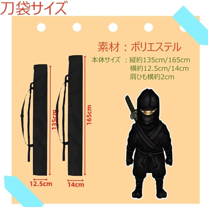 【仕様】本体サイズ :縦約135cm、横約12.5cm;肩ひも横約2cm;カラー:ブラック;パッケージ内容:長さ1M以下の竹刀が収納できる布袋。