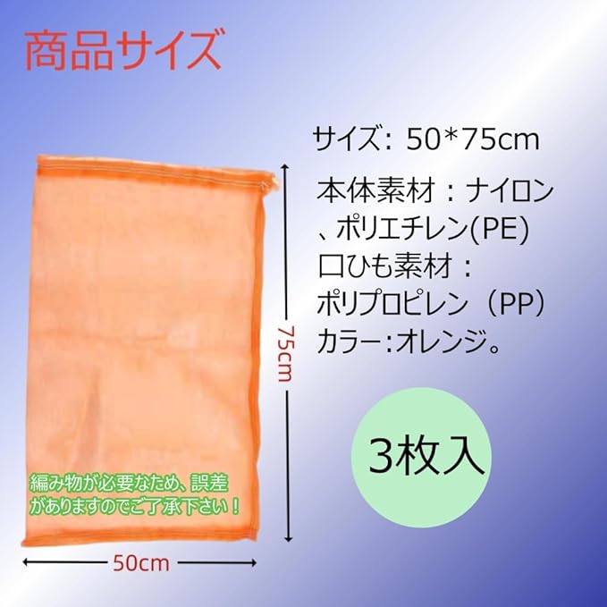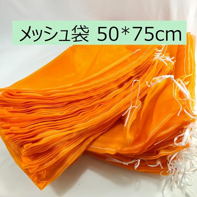 メッシュ袋 50*75cm 多目的 メッシュバッグ ネット 果物収納袋 魚網 3枚入 潮干狩り 多用途 園芸工具 農業用 通気性 光通過 ナイロン製 しぼりロープ付 口ひも付き 目合2mm オレンジ