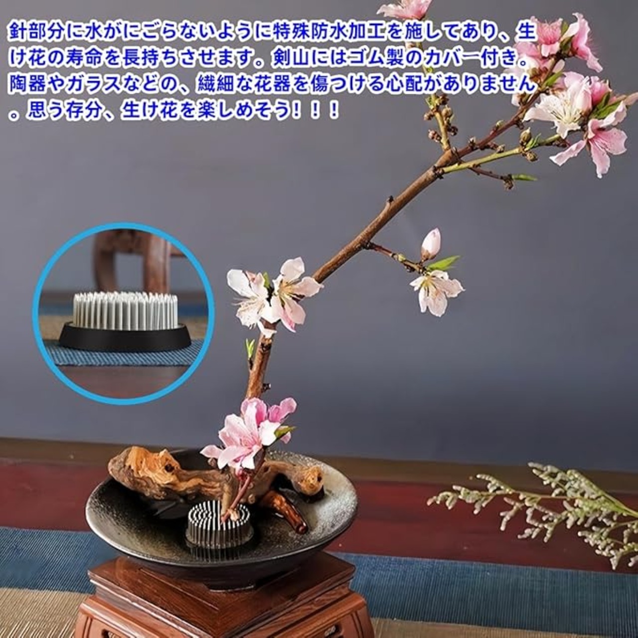 針部分に水がにごらないように特殊防水加工を施してあり、生け花の寿命を長持ちさせます。剣山にはゴム製のカバー付き。陶器やガラスなどの、繊細な花器を傷つける心配がありません。思う存分、生け花を楽しめそう。