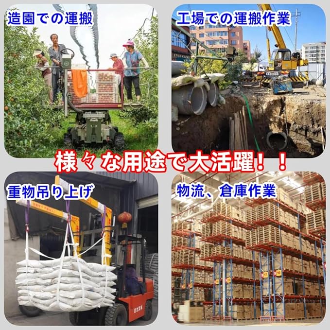 【多用途の応用】造園での運搬や土木作業に、製材木工などの運搬作業に、重物吊り上げ/高所吊り/港湾荷役/電気工事に、工場での運搬作業に、物流、倉庫作業など、様々な作業ニーズに対応します。