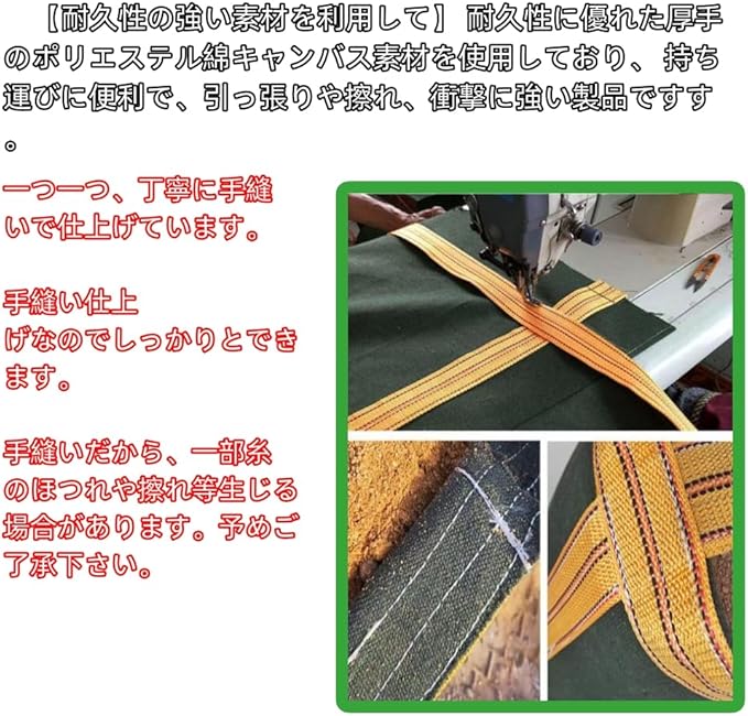 【耐久性の強い素材を利用して】 耐久性に優れた厚手のポリエステル綿キャンバス素材を使用しており、 持ち運びに便利で、引っ張りや擦れ、衝撃に強い製品ですす。