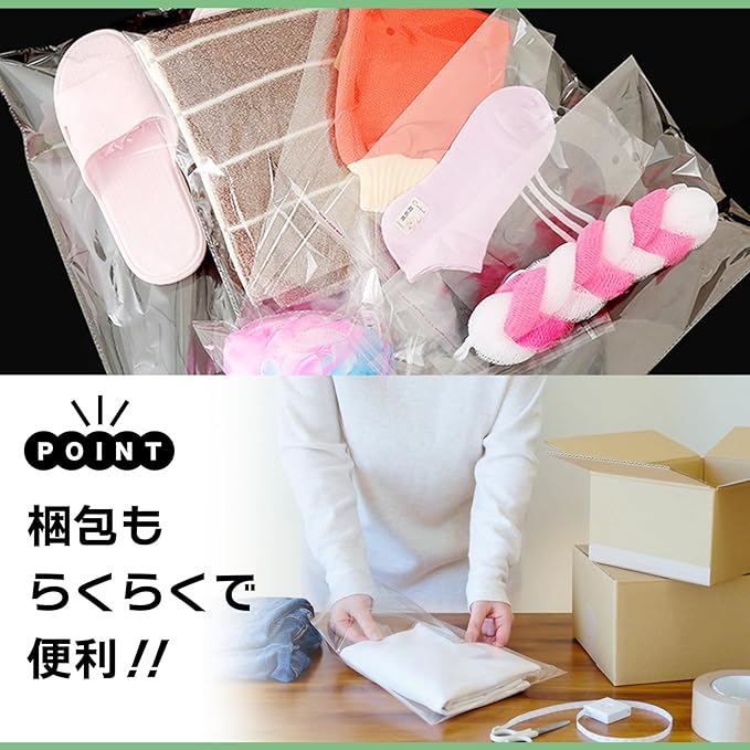 透明度の高いビニール製で、商品がきれいに見えるのも人気の秘訣。物販、フリーマーケット、DIY、バザー、イベント、個展、展示会などの出展品や景品、商品の梱包、包装に最適。中身を見せたいラッピングにもこの透明袋が活躍。