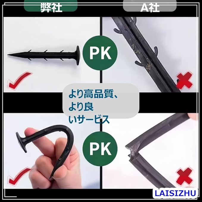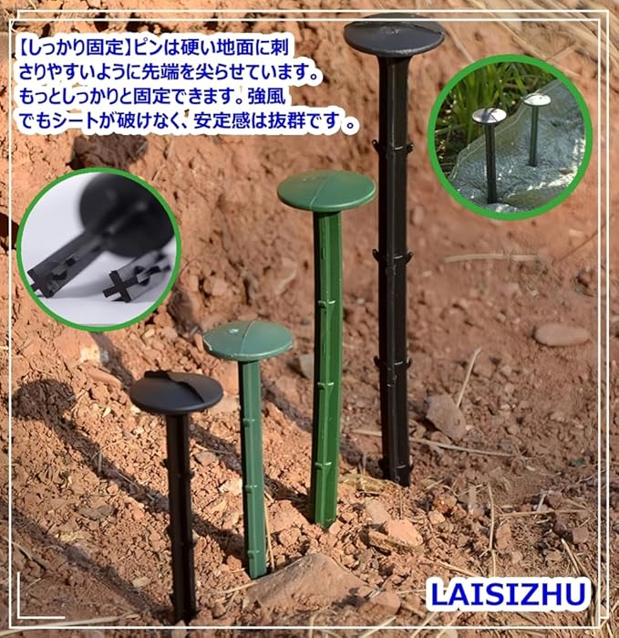 商品名:LAISIZHU 園芸用防草シート用おさえピン 50本組【特長】●返し(トゲ)付きでしっかり固定できる押さえピン。●防草シートや園芸用不織布シート、農業用マルチシートの固定に。●軽量でさびる心配の少ないポリプロピレン製。●先端が鋭利で刺し込みやすい。アウトドアなどの際にも。【ご注意】●先端が尖っていますのでお取り扱いには十分ご注意ください。●ピンを打ち込む際は地面に向かって垂直に打ち込んでください。